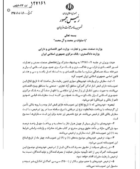 مصوبه هییت وزیران در خصوص لغو ممنوعیت واردات خودروهای باقیمانده در گمرکات ۱۸ دی ۱۳۹۷