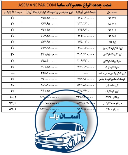 انواع محصولات سایپا اعلام شد. براساس این لیست افزایش قیمت ها در محصولات