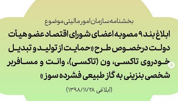 بخشنامه سازمان امور مالیتی موضوع ابلاغ بند ۹ مصوبه اعضای شورای اقتصاد عضو هیات دولت درخصوص طرح «حمایت از تولید و تبدیل خودروی تاکسی، ون (تاکسی)، وانت و مسافر بر شخصی بنزینی به گاز طبیعی فشرده سوز»