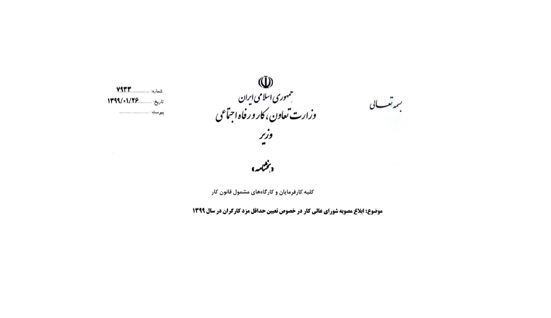 طبق بخشنامه شماره 7933 مورخ 99/01/26 وزارت تعاون، کار و رفاه اجتماعی در خصوص ابلاغ مصوبه شورای عالی کار در خصوص تعیین حداقل مزد کارگران در سال 1399 اعلام شد