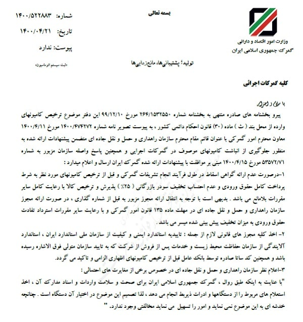در این بخشنامه آمده: در صورت عدم ارائه گواهی اسقاط در طول فرآیند انجام تشریفات گمرکی و قبل از ترخیص کامیونهای مورد نظر به شرط پرداخت کامل حقوق ورودی و عدم احتساب تخفیف سود بازرگانی ۲۵ درصد، پذیرش و ترخیص کالا با رعایت کامل سایر مقررات بلامانع است. بدیهی است با توجه به انتقال ارائه مجوز مزبور به قبل از شماره گذاری، در صورت ارائه مجوز سازمان راهداری و حمل و نقل جادهای در مهلت ماده ١٣٥ قانون امور گمرکی و با رعایت سایر مقررات استرداد تفاوت حقوق ورودی به میزان تخفیف پیش بینی شده میسر است.